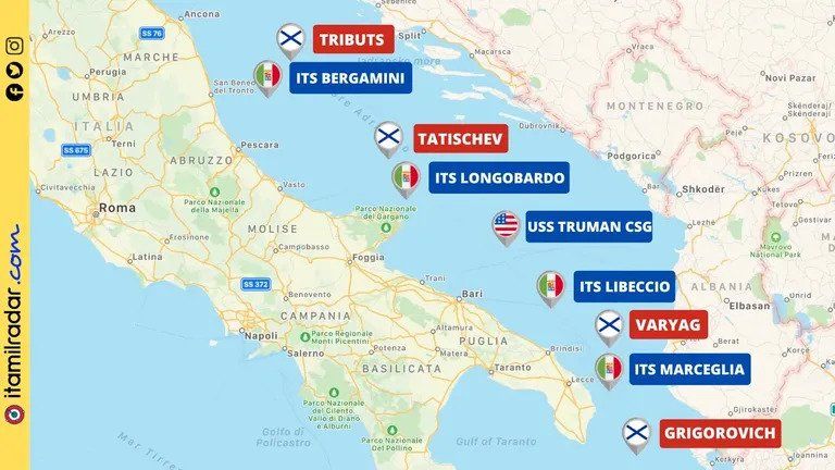 Kako prenosi portal specijaliziran za praćenje talijanske mornarice i zrakoplovstva, u Jadransko more ušla su tri ruska broda: razarač Admiral Tribuc, u središnjem Jadranu, obavještajni brod Vasilij Nikitič Tatiščev te krstarica Varjag koja je djelovala u južnom Jadranu. U isto vrijeme, fregata Admiral Grigorovič je djelovala u Jonskom moru.