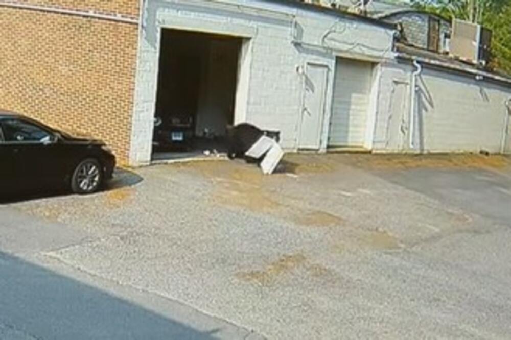 Na snimci se vidi kako medvjed iz garaže izvlači kutiju keksa i nosi je na parkiralište.