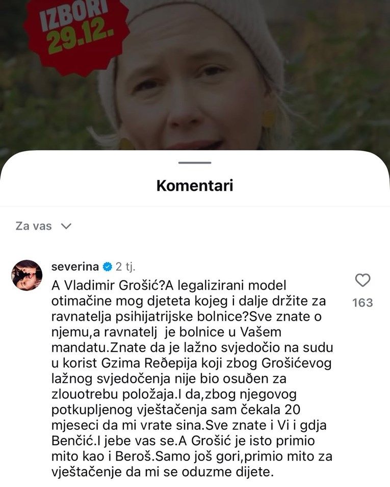 Severina je u svojoj objavi izravno prozvala i političare. Prema njezinim riječima Grošića su “postavili iz Možemo!, a zadržali HDZ-ovci”. Pjevačica je otkrila da je nekoliko tjedana prije tragedije u komentaru ispod jedne objave na Instagramu podsjetila Ivanu Kekin, zastupnicu Možemo!, na njegovu kontroverznu prošlost.