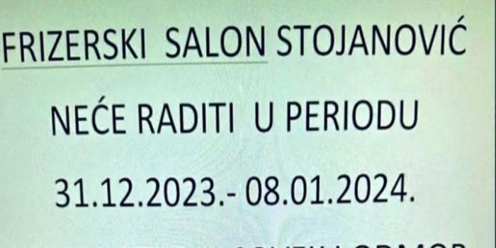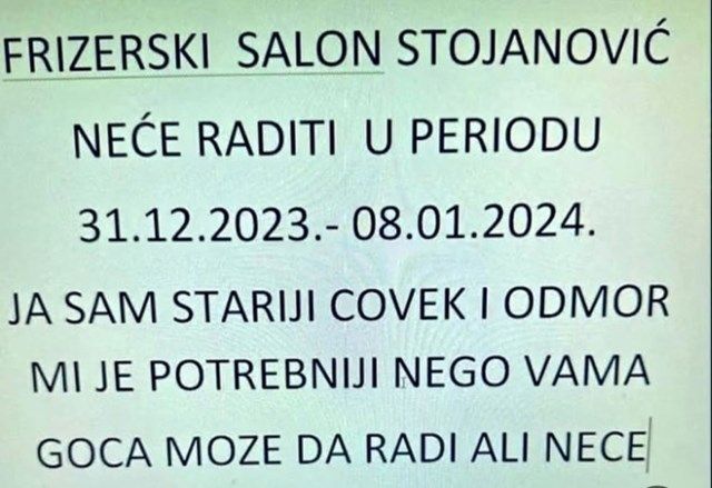Home Mozaik Regionom kruži obavijest koju je frizer iz Srbije ostavio mušterijama, ljudi ostali... Mozaik Regionom kruži obavijest koju je frizer iz Srbije ostavio mušterijama, ljudi ostali zbunjeni! By dš - January 7, 2024 0 FacebookTwitterPinterestWhatsAppTelegram Gospodinu frizeru, a i Goci, želimo da se pošteno odmore 😂