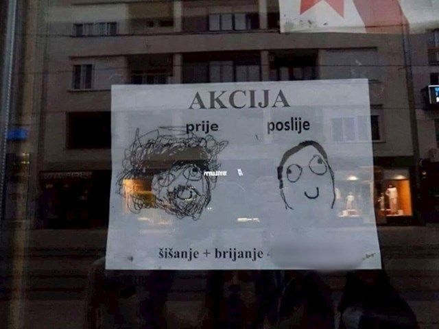 Home Mozaik Reklama na jednom frizerskom salonu nasmijala je prolaznike, a fotografija se proširila... Mozaik Reklama na jednom frizerskom salonu nasmijala je prolaznike, a fotografija se proširila diljem zemlje By m s - January 24, 2025 0 FacebookTwitterPinterestWhatsAppTelegram c09a00ae 2329 45f2 8f06 e42531142a9c Jedan frizerski salon u Zagrebu uspio je nasmijati i svoje mušterije, i slučajne prolaznike, a fotka njihove duhovite reklame brzo je postala hit na društvenim mrežama. Dokaz da je za iskren osmijeh ponekad dovoljno samo malo kreativnosti! ec1e5dcd 8f87 471b 9871 eb72228bed0a