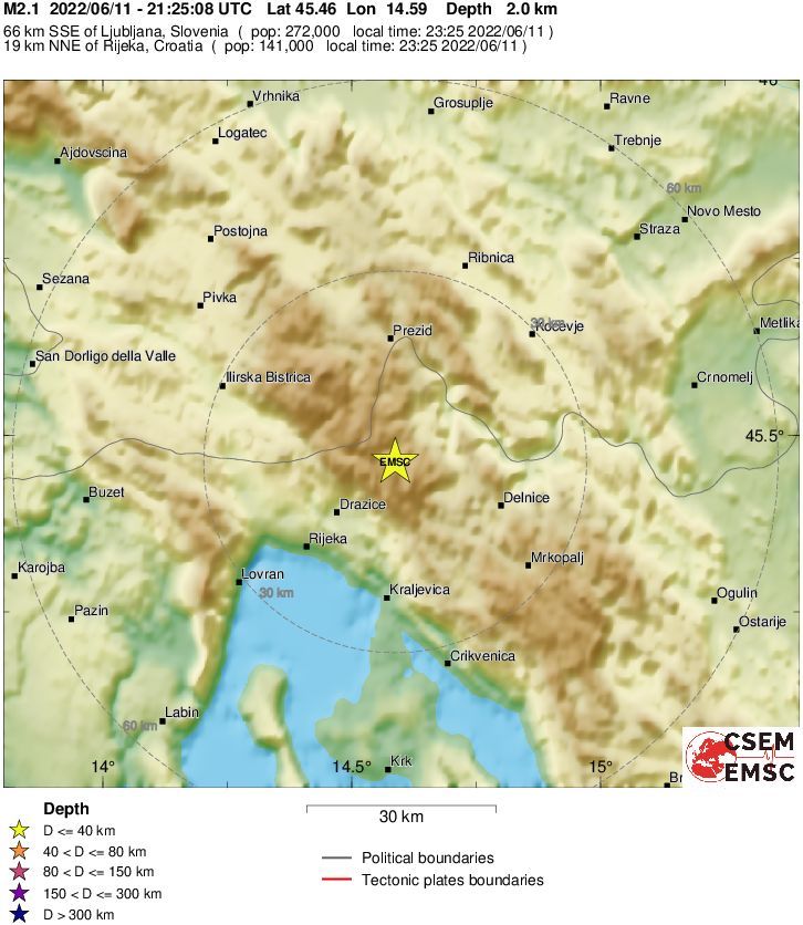 Sinoć u 23:25 sati u Rijeci se osjetio potres manjeg intenziteta prema informacijama s web stranice emsc-csem.org, epicentar potresa bio je 19 kilometara sjeverno-sjeveroistočno od Rijeke, a intenzitet 2,1 stupanj.
