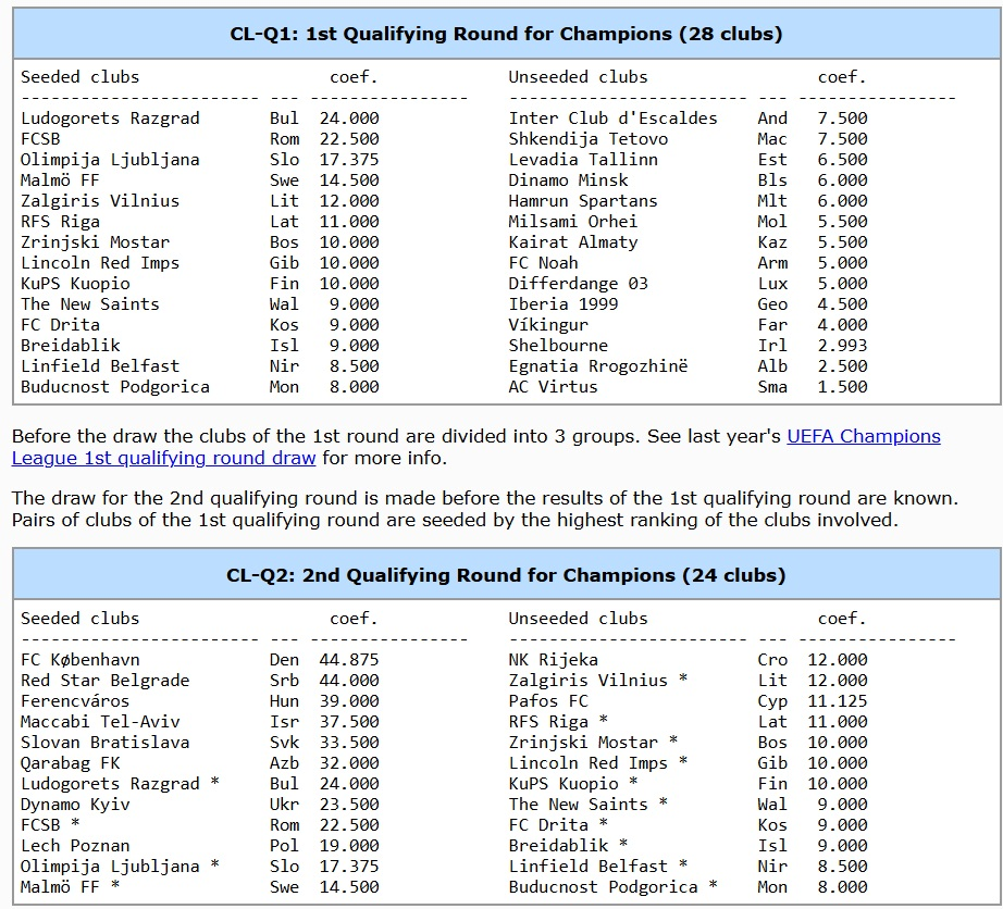 (*) klubovi označeni zvjezdicom moraju prvo proći prvo pretkolo. Ako budu izbačeni, njihov koeficijent preuzima ekipa koja ih izbaci, što može dodatno promijeniti potencijalni ždrijeb.