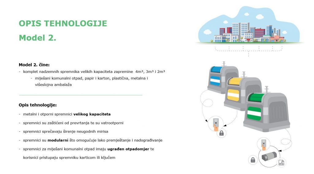 Korisnici mogu pristupiti spremnicima pomoću kartice ili ključa, a spremnici za miješani komunalni otpad imaju ugrađen mjerni sustav za praćenje predane količine otpada od strane korisnika. S obzirom na to da se radi o spremnicima većih kapaciteta, bit će postavljeni rjeđe nego postojeća mreža spremnika koji imaju zapreminu od 1,1 m3, no s druge strane, radi se o spremnicima koji zahtijevaju i manje operativne troškove, budući da ih može prazniti sam vozač. Preliminarna okvirna procjena troška implementacije za model iznosi 65,5 milijuna kuna, dok se procjenjuje kako bi godišnji troškovi održavanja iznosili 2,5 milijuna kuna.