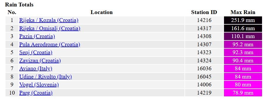 Prema podacima stranica Tottonweather, Rijeka je u posljednjih 24 sata postala najkišovitije mjesto na svijetu. To znači da je po kvadratnom metru palo 251.9 mm kiše. Osim Rijeke, u prvih 10 pozicija se još nalazi 6 hrvatskih lokacija.