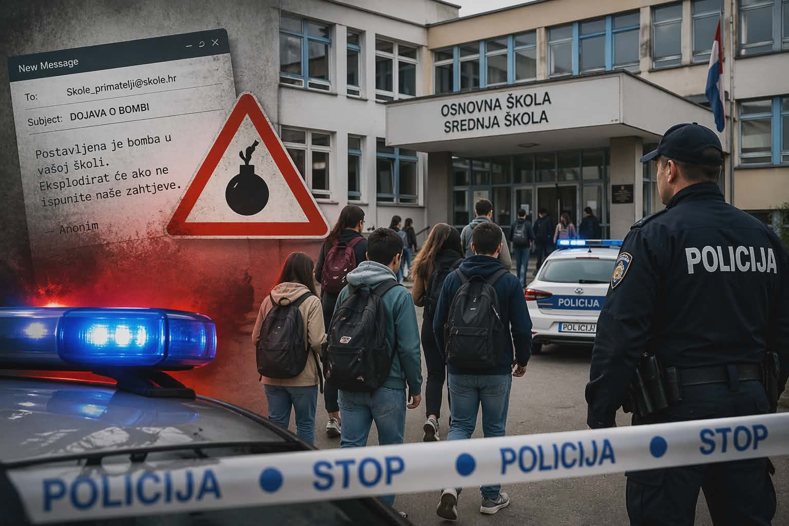 U gotovo svim srednjim školama Primorsko-goranske županije jutros je obustavljena nastava nakon dojave o bombama, a učenici i djelatnici su evakuirani. Prema informacijama koje je potvrdila županijska pročelnica za odgoj i obrazovanje, ravnatelji su po dolasku na posao zaprimili e-mail s prijetnjom da se u školama nalazi eksploziv PETN, zbog čega su odmah aktivirane sigurnosne procedure i pozvana policija. Dojave su stigle u više gradova, uključujući Rijeku, Opatiju, Crikvenicu i Čabar, dok osnovne škole nisu bile obuhvaćene.