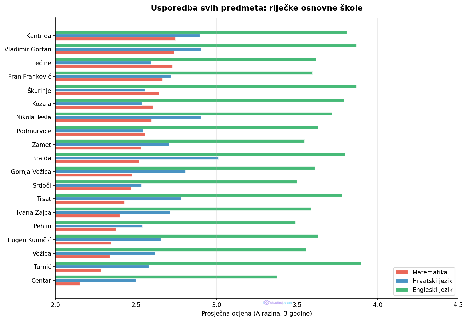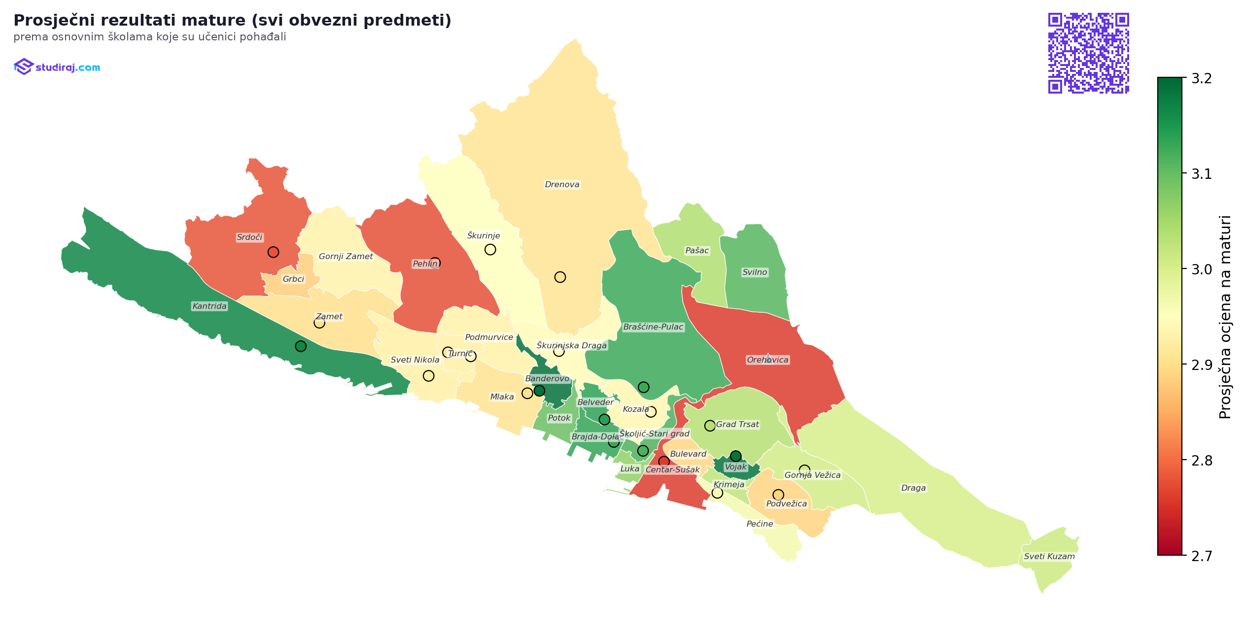 Na drugom kraju nalaze se OŠ Centar s ukupnim prosjekom 2.51 i OŠ Podmurvice s 2.58, koje čine najslabiji dio riječke karte. Taj podatak posebno je zanimljiv jer se razlikuje od obrazaca u Splitu i Zagrebu, gdje centar grada uglavnom ostvaruje bolje rezultate. U Rijeci je slika upravo suprotna: OŠ Centar nalazi se pri samom dnu.