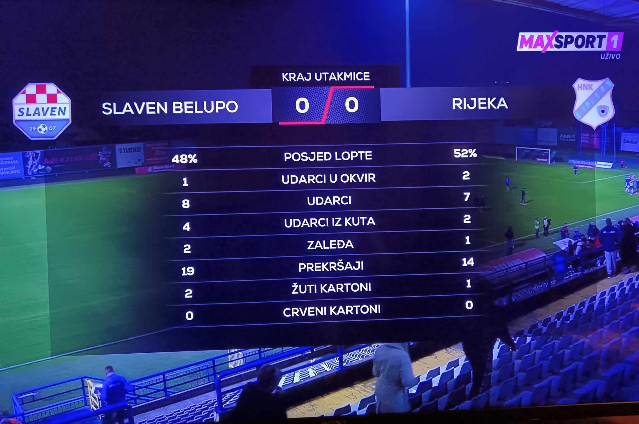 Iako je Slaven bio bliži pobjedi, najbolju priliku na utakmici propsutila je rijeka u 42. minuti. Fruk je promašio zicer nakon što je sam izašao pred Sušaka, no obranio mu je golman Slavena. Pucao je ofenzivni veznjak Rijeke još jednom nakon obrane, ali nije ni tad uspio zabiti.