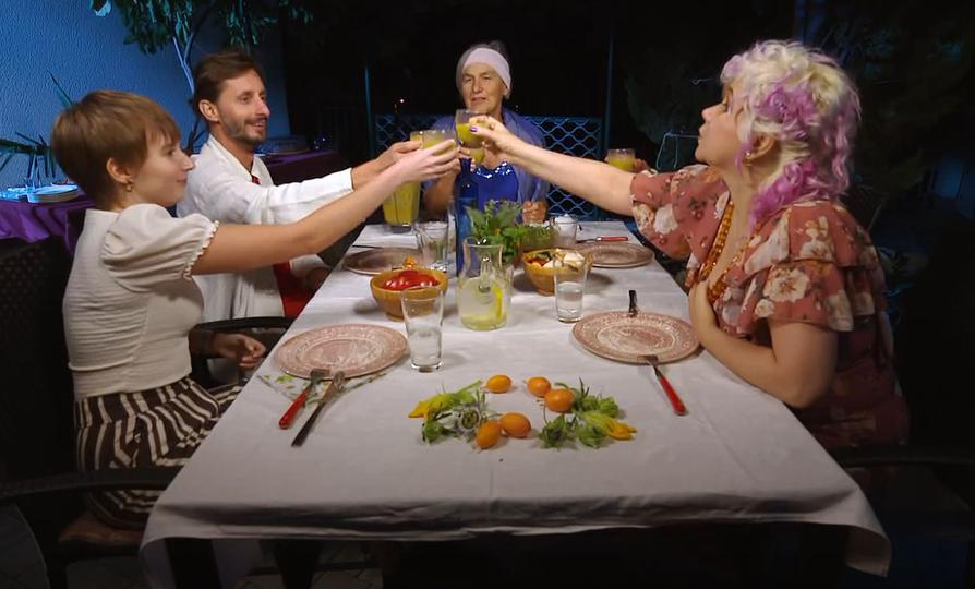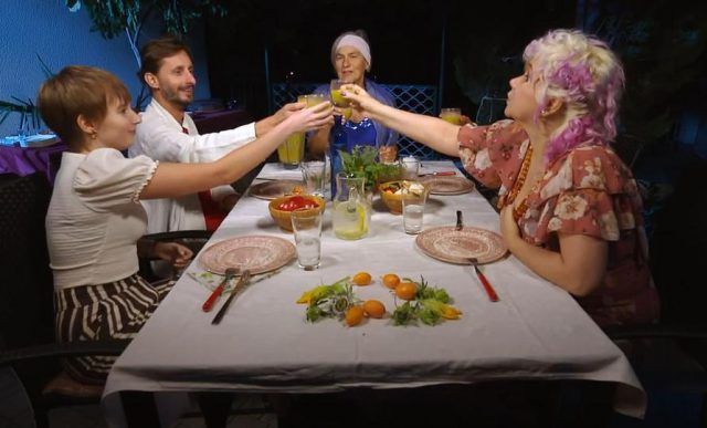 „Ipak bih više voljela onu svoju travaricu, gdje ima tih biljaka da te drmne iznutra i izvana“, rekla je Nikita, a Irena u šali dodala: „Što će tebi više da te drmne?!“ Kad su probali aperitiv, Željko je komentirao: „Bio mi je prežestok“, a Mirjam se nije baš svidjelo jer joj je bio kao smoothie od celera. Spomenka je potom donijela predjelo – svježi sir od badema, koji se maže po povrću, ukrašeno klicama, a domaćica je potom svakome posebno stavljala namaz na različite komade povrća. „Serviranje s rukama sve nas je šokiralo“, rekao je Željko, a Mirjam dodala: „Uopće ne volim kad se nešto tako poslužuje s rukama.“ Nikita i Irena također su bile iznenađene; pjevačica i glumica klice je usporedila s jeguljicama, a Mirjam se nije svidjelo što i pribor nije bio za stolom. „To se sve jede rukama“, govorila im je Spomenka, a Mirjam je komentirala kako je mislila da joj se neće svidjeti, ali bilo joj je fino.