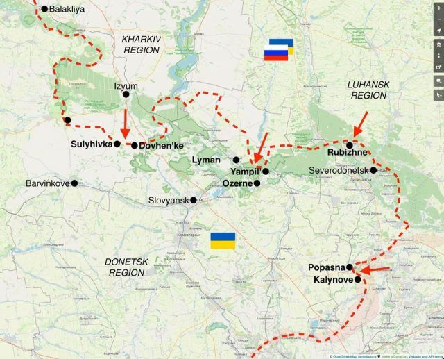 Jedna od prijetnji s kojima su suočene ruske snage u Donbasu je spora, ali postojana ukrajinska ofenziva N-E od Harkova. Tamošnje ruske snage imaju neadekvatne resurse da se nose s ovim ukrajinskim potezom i moraju brzo reagirati ili bi Ukrajinci mogli prekinuti ili poremetiti ruske komunikacijske i opskrbne linije prema Izyumu.