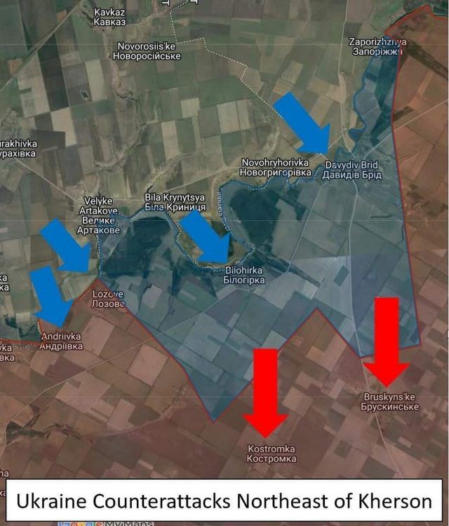 Ukrajinska ofenziva u Hersonu ide dobro usprkos onome u što prenose ruski Telegram kanali: ukrajinske trupe uspjele su forsirati prijelaz preko rijeke Inhulets. Proširili su svoj mostobran na dubinu od najmanje 9 km prema Bruskynskim i Davidov Bridu. S ruske strane frontu drže elementi koji pripadaju ruskoj 58. armiji. Te jedinice drže frontu dugu gotovo 200 km i bore se od prvog dana ovog sukoba (sada 98 dana).