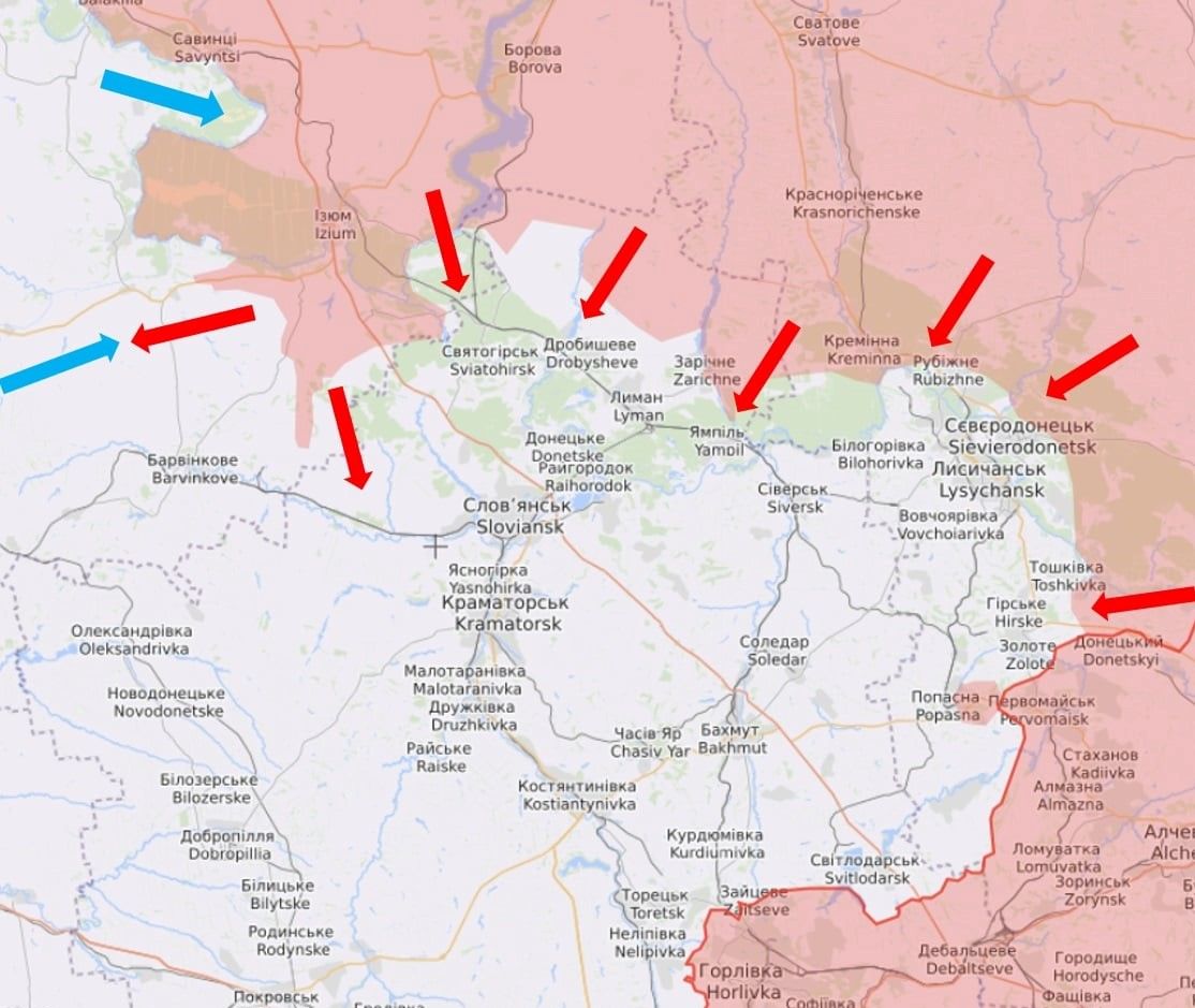 Ruske snage probile su ukrajinsku obranu u Velikoj Komyshuvakhi i Zavodi, oba jugozapadno od Izjuma. Time su ruske snage preuzele kontrolu nad cestom P79 koja povezuje Donbas sa zapadom zemlje. Od Velike Komyshuvakhe, udaljeni su manje od 25 km sjeverno od Barvinkove. Zauzimanje Barvinkove omogućilo bi ruskim snagama da udare na Slavjansk i Kramatorsk sa stražnje strane. Glavna opskrbna cesta koja je trenutno preostala za Ukrajince je E50 Dnjepar-Donjeck. Čini se da Rusi trenutno nisu u poziciji ugroziti tu cestu.