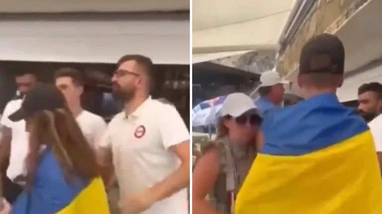 Russian tourist in Montenegro attacks Ukrainian family for having Ukrainian flags.