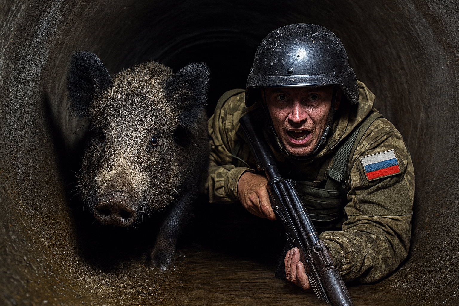 Na društvenim mrežama pojavio se video iz Harkivske oblasti koji prikazuje ruskog vojnika kako puže kroz plinsku cijev u blizini Kupjanska. Dok je pokušavao ostati neprimijećen, iza njega se začuo šum, a zatim je kroz cijev projurila divlja svinja. Iznenađeni vojnik od šoka nije stigao ni pravilno uhvatiti oružje, što je izazvalo lavinu komentara na internetu.