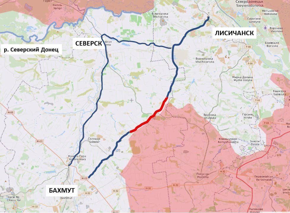 U tijeku su borbe za kontrolu nad Bolshaya, Kamyshevakha, Vernopolya, Dubrovne, Dolyna, Bogorodichne i Svyatohirsk. Ruski izvori tvrde da je Svyatohirsk pod njihovom kontrolom, iako ukrajinski izvori tvrde da su borbe na tom mjestu još uvijek u tijeku. Borba za Bogorodične je zabrinjavajuća za Kijev: to znači da se Rusi bore preko rijeke Siverskyi Donets. Neki ruski izvori tvrde (od večeras) da ruske i separatističke snage sada kontroliraju cijelu sjevernu obalu rijeke od Izjuma do Severodonjecka. Ruske trupe blizu su zatvaranja ceste Soledar-Lysychanks (1302). Prijeteće su blizu i Bakhmuta i Slavjanska.