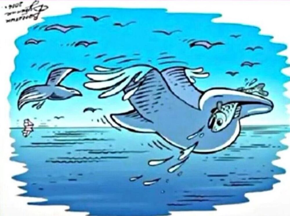 Kada okrenete fotografiju, vidjet ćete jato ptica kako leti iznad oceana, a zatim dupin postaje pelikan.
