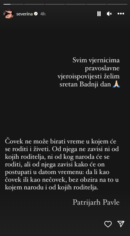 Na svom Instagram profilu, Severina je podijelila srdačnu čestitku, pišući: “Svim vjernicima pravoslavne vjeroispovijesti želim sretan Badnji dan.” Osim toga, dodala je inspirativan citat patrijarha Pavla, koji glasi: “Čovjek ne može birati vrijeme u kojem će se roditi i živjeti. Od njega ne zavisi ni od kojih roditelja, ni od kog naroda će se roditi, ali od njega zavisi kako će on postupati u datom vremenu – kao čovjek ili kao nečovjek, bez obzira na to u kojem narodu i od kojih roditelja.”
