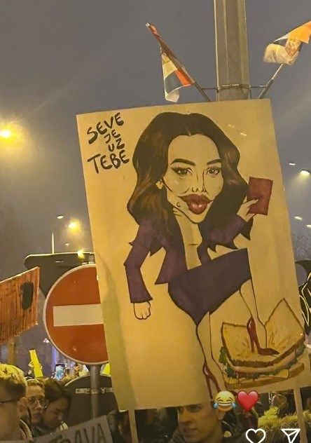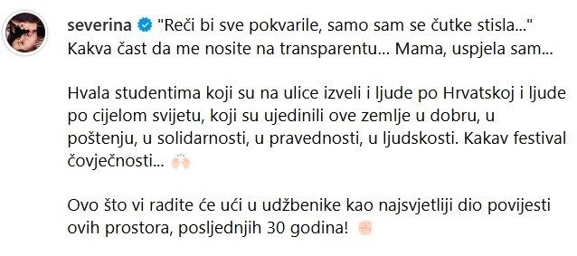 Na prosvjedu se istaknuo i plakat na kojem je prikazan crtež pjevačice Severine, a koji su studenti ponovo koristili na transparentima. 52-godišnja pjevačica objavila je na Instagramu poruku zahvalnosti: