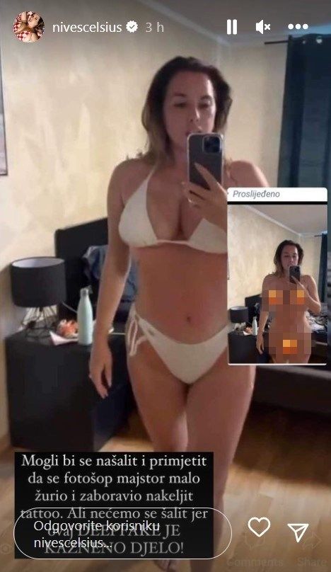 “Mogli bi se našaliti i primijetiti da se fotošop majstor malo žurio i zaboravi nakeljiti tattoo. Ali nećemo se šaliti jer ovaj deepfake je kazneno djelo”, napisala je Nives. Nije objavila je li kontaktirala policiju, kao ni o čemu se točno radi i tko širi lažne fotografije.