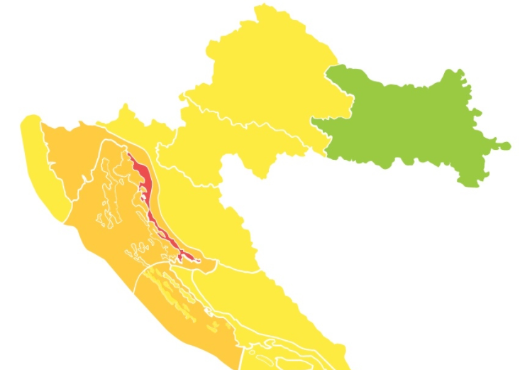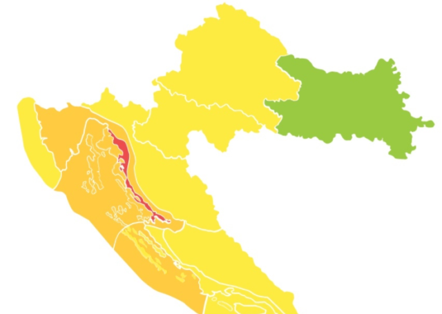 Narančasto upozorenje izdano je za područje riječke regije, Kvarnera i Kvarnerića te u drugom dijelu dana za sjevernu Dalmaciju. Podno Velebita očekuje se olujna bura. Najjači udari vjetra 65-120 km/h.