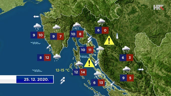 Oborina će lokalno biti obilna, a uz pad temperature kiša će sredinom dana prelaziti u susnježicu i snijeg, ponajprije u gorskim predjelima, ponegdje i u nizinama, prognozira za Božić Državni hidrometeorološki zavod (DHMZ).