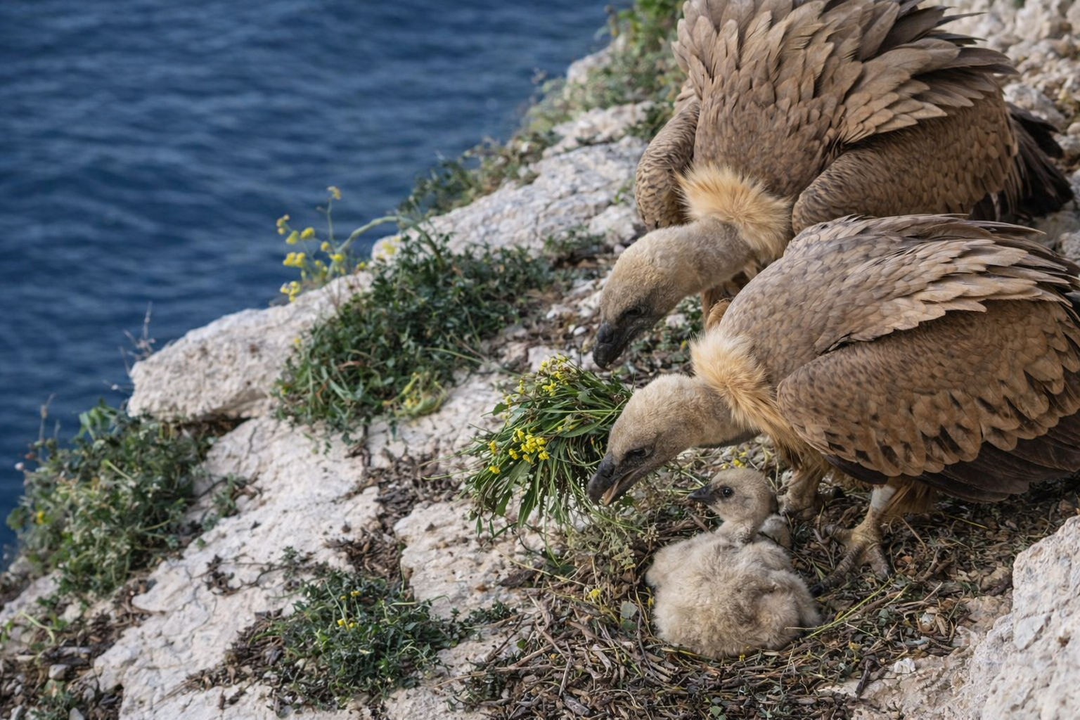 brinu se o ptiću, hrane ga, štite i stalno popravljaju gnijezdo kako bi ostalo sigurno na strmoj stijeni.