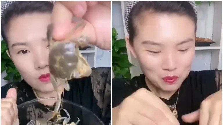 Spomenuta djevojka po svemu sudeći je Japanka (tako je rečeno u komentarima). a proslavila se pojaviše zahvaljujući zapisima na kojima jede žive račiće prelivene rajčicom i začinima.