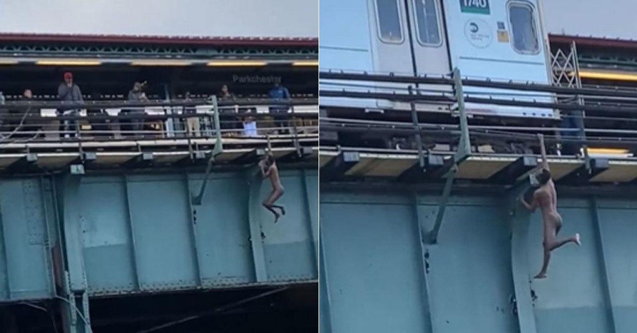 Šokantan video potpuno golog muškarca koji visi i zatim pada sa nadvožnjaka u Bronxu širi se Twitterom, prenosi New York Post.
