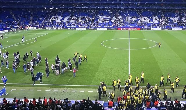 Nakon utakmice igrači i stručni stožer slavili su na terenu Espanyola, kluba s kojim imaju veliko povijesno rivalstvo koje je povezano i sa sukobima na liniji katalonskih separatista i španjolskih monarhista. U televizijskom prijenosu vidjelo se kako Barcelonini igrači pozdravljaju svoje navijače, a već u idućem trenutku počeli su bježati prema svlačionici jer su bijesni domaći navijači upali u teren.