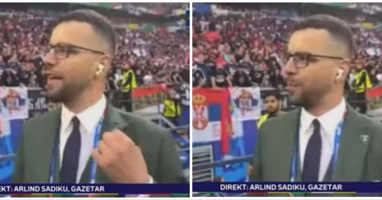 Što se dogodilo? Sinoć se za kosovsku televiziju sa stadiona u Gelsenkirchenu javljao spomenuti novinar Arlind Sadiku koji se, tijekom TV javljanja, okrenuo prema tribini srpskih navijača i rukama pokazao dvoglavog orla.