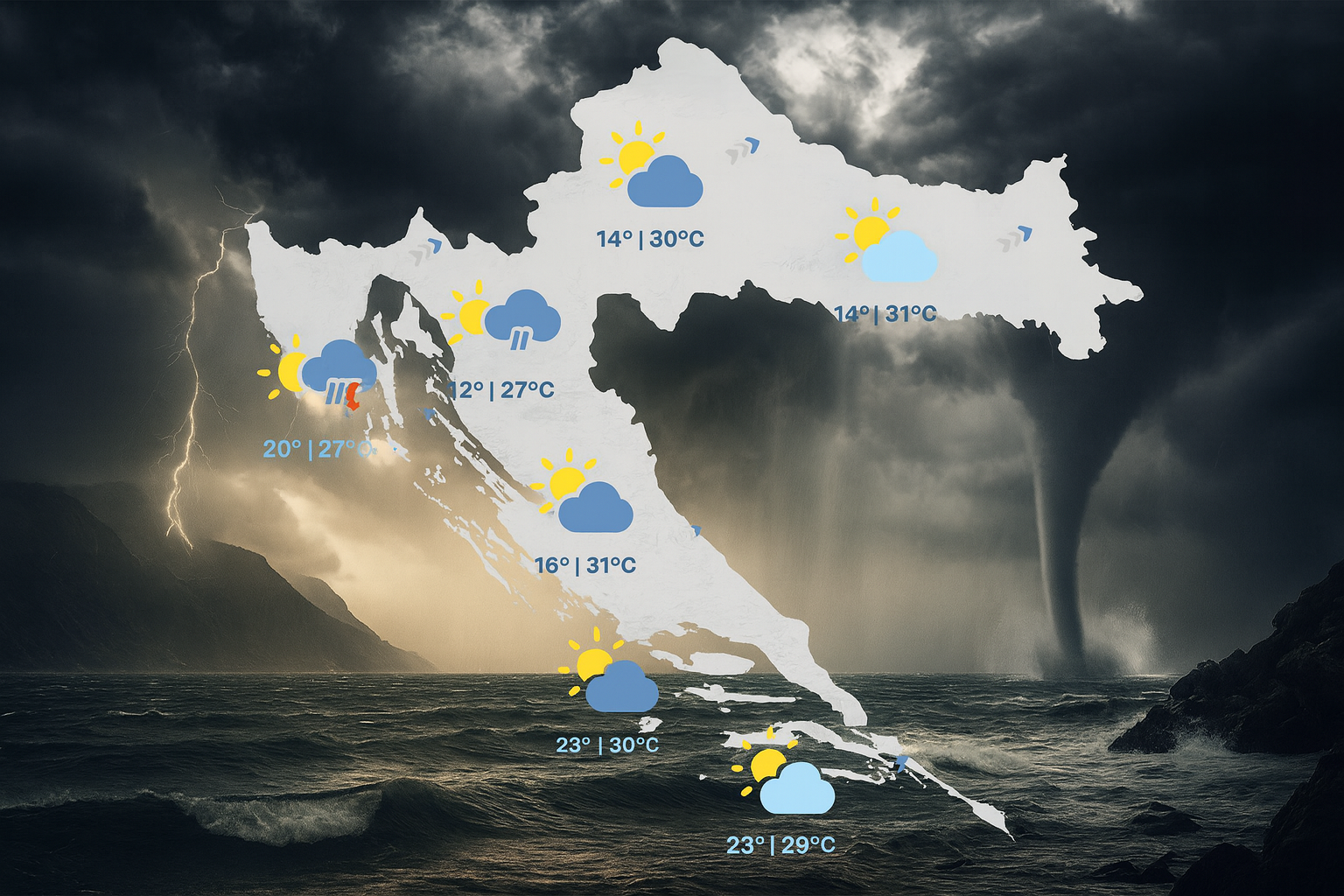 Najkritičnije razdoblje bit će od srijede do petka, kada se na obali očekuju pijavice, a u unutrašnjosti izraženi pljuskovi i grmljavina. Vakula upozorava da će nagle promjene tlaka i vremena utjecati i na osjetljivije meteoropate.
