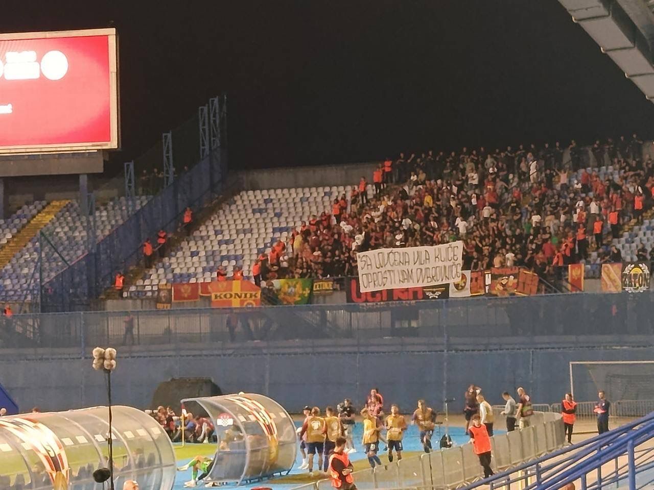 Početkom drugog poluvremena pažnju javnosti privukli su navijači Crne Gore, smješteni na južnoj tribini. Oni su podigli transparent s porukom: