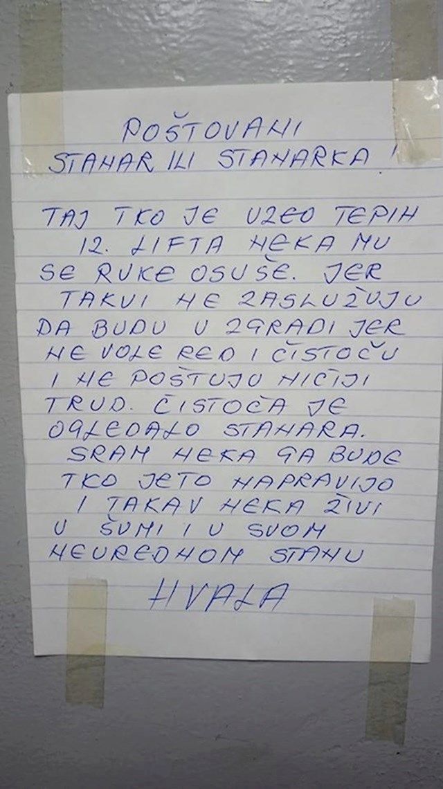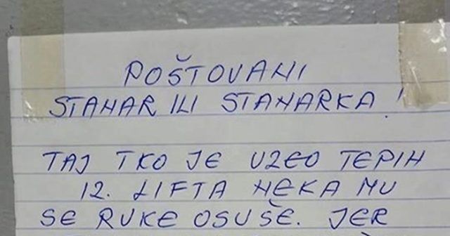 Jedna starija stanarka imala je zanimljivu ideju. Htjela je malo urediti lift u stambenoj zgradi u kojoj živi. Međutim, čini se da se to nije svidjelo nekome od susjeda. Već nakon kratkog vremena netko ju je razočarao, a ona je odlučila ostaviti poruku ostalim stanarima. (index.hr)