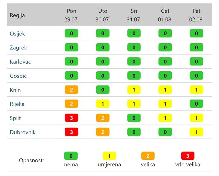Najviše dnevne temperature kretat će se od 27 do 31 stupanj, dok će na Jadranu i u unutrašnjosti Dalmacije biti između 31 i 35 stupnjeva Celzijevih. Posebno je važno istaknuti da je za splitsku i dubrovačku regiju oglašena velika opasnost od toplinskog vala.