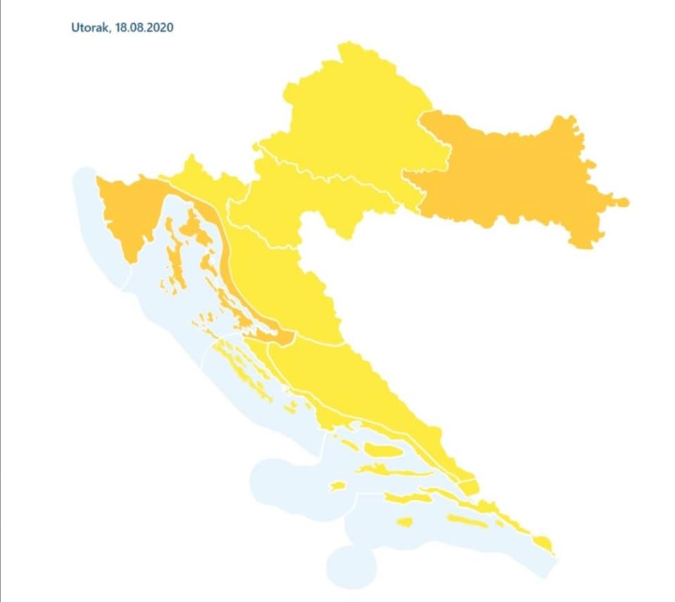 Nevrijeme će se tijekom noći i sutrašnjeg dana premjestiti preko cijele Hrvatske. Za cijelu zemlju na snazi su upozorenja Meteoalarma. Narančasto je na snazi za Slavoniju i Istru i Kvarner, dok je za ostatak zemlje na snazi žuti alarm.