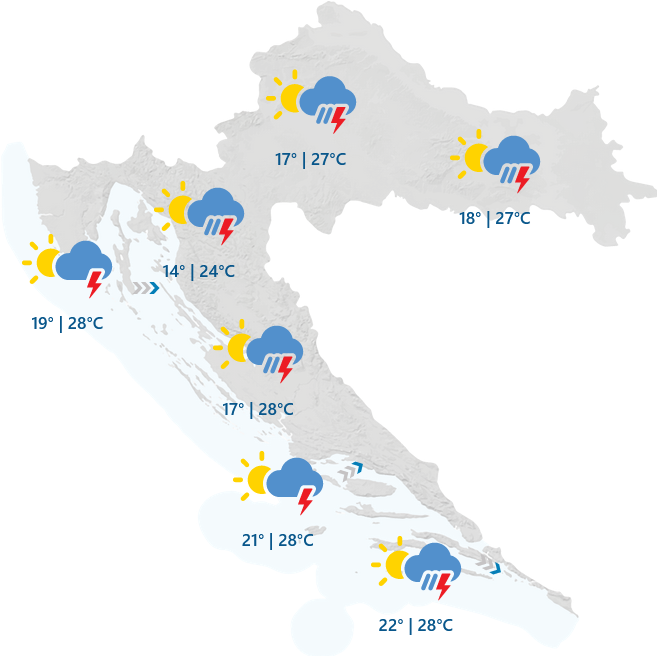 Djelomice sunčano s promjenjivom naoblakom. Mjestimice pljuskovi i grmljavina koji mogu biti izraženiji, osobito poslijepodne u unutrašnjosti Dalmacije. Puhat će umjeren sjeverozapadni, uz obalu i jugozapadni vjetar. Najviša temperatura zraka od 26 do 29°C.