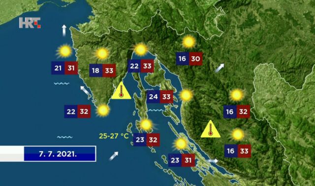 Još će vruće biti danju u Dalmaciji, u unutrašnjosti i do 37°C, malo ugodnije na obali i otocima gdje će puhati umjeren vjetar s mora. More će biti mirno, samo na jugu malo, prema otvorenome moguće i umjereno valovito. Vjetar umjeren zapadni i sjeverozapadni, duž obale danju i jugozapadni. Uz obilje sunca temperatura će porasti do oko 33°C, u unutrašnjosti i više, a ni noćne vrijednosti mnogima neće dopustiti kvalitetan odmor.