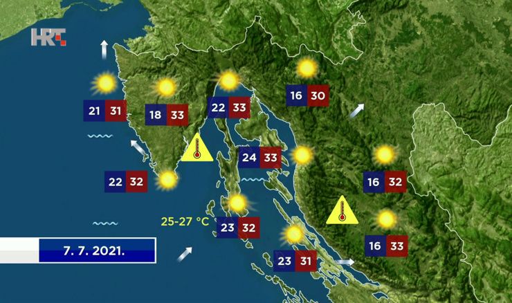 Pretežno sunčano, ponegdje s umjerenom naoblakom te vruće i vrlo vruće. Vjetar slab do umjeren jugoistočni i jugozapadni, na Jadranu u drugom dijelu dana mjestimice zapadni i sjeverozapadni. Najniža jutarnja temperatura od 17 do 22, u gorju malo niža, a na Jadranu između 21 i 26°C. Najviša dnevna uglavnom između 34 i 39°C, ponegdje na Jadranu i u gorju malo niža.
