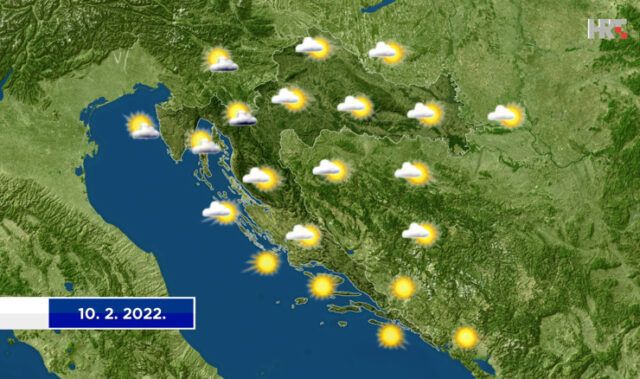 I u Dalmaciji uglavnom slab vjetar i more mirno. Duž obale nebo gotovo bez oblačka, a u unutrašnjosti će povremeno biti male naoblake, ujutro uz temperaturne “minuse”, ponegdje i mraza. Popodnevna pak temperatura zraka uglavnom između 13 i 16 °C.