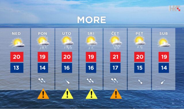 Na Jadranu od utorka promjenjivo i nestabilno, često s kišom pa i u obliku obilnijih pljuskova, osobito u noći između srijede i četvrtka. Puhat će umjereno i jako, mjestimice i olujno jugo i južni vjetar, a u utorak prolazno sjeverozapadnjak”, objavio je HRT.