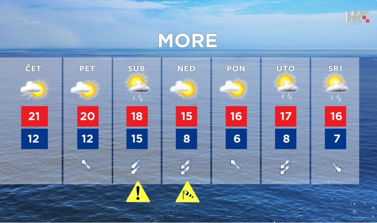 Još nestabilnije i svježije u gorju, dok će se do večeri u Istri i na sjevernom Jadranu još zadržati suho, pa i barem djelomice sunčano, uz slabo do samo rijetko gdje moguće umjereno jugo i južni vjetar, koji će malo do umjereno valovito more prouzročiti i na pretežno sunčanom srednjem Jadranu. U unutrašnjosti Dalmacije oblačnije uz mogućnost ponekog pljuska uglavnom uz granicu. Bit će i dalje razmjerno toplo, na još u petak sunčanome jugu Hrvatske uz temperaturu ujutro uglavnom 12 do 15 °C, poslijepodne uz slabo do umjereno jugo – 19, 20 °C.