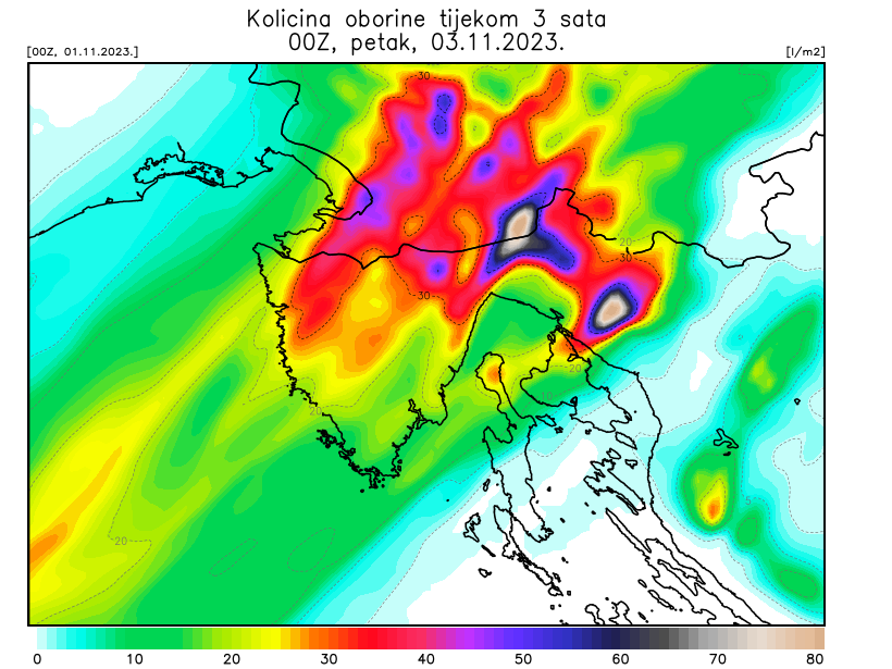 U noći na petak slijedi i prolazak fronte uz naglo okretanje vjetra na jugozapadnjak, što će biti praćeno kišom i grmljavinskim pljuskovima. U samo nekoliko sati može pasti više od 50 mm kiše, što će uzrokovati lokalno bujanje potoka i rijeka.