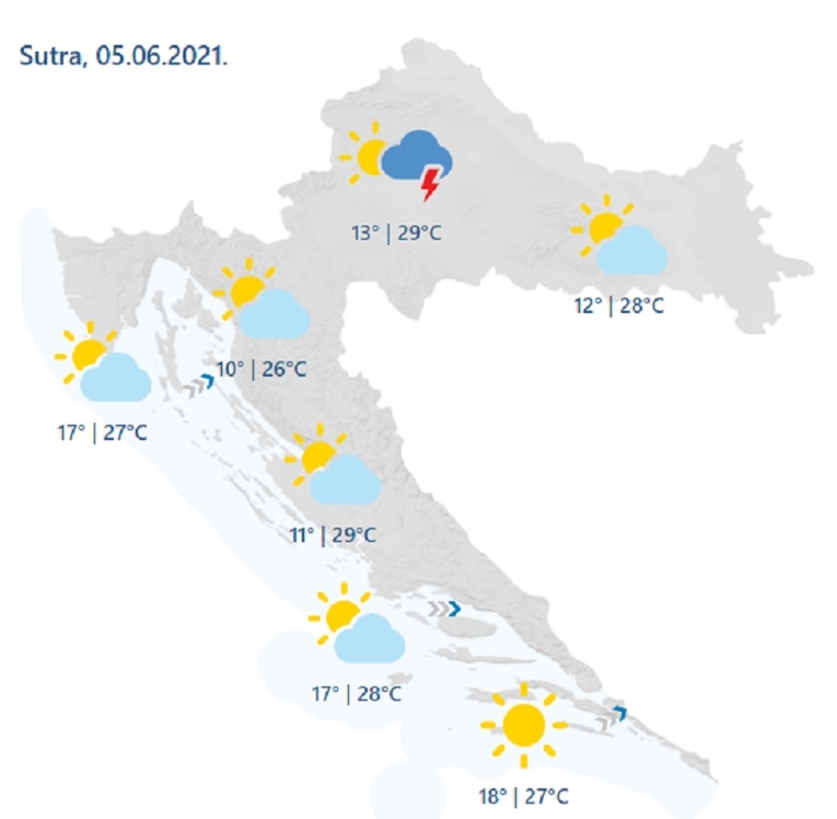 “Pretežno sunčano, povremeno uz umjerenu naoblaku. Poslijepodne uz umjeren do jak razvoj oblaka u gorskim i središnjim krajevima, i to ponajprije uz granicu sa Slovenijom, postoji vjerojatnost za lokalne pljuskove i grmljavinu. Vjetar većinom slab, na Jadranu od sredine dana i umjeren zapadni i jugozapadni. Najniža jutarnja temperatura između 10 i 15, na Jadranu od 15 do 19, a najviša dnevna uglavnom između 25 i 30 °C”, objavio je DHMZ.