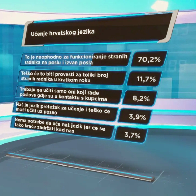 Građani su u velikoj većini suglasni da strani radnici trebaju učiti hrvatski jezik. Preko 70% ispitanika smatra da je poznavanje jezika nužno za uspješno funkcioniranje na poslu i u svakodnevnom životu.