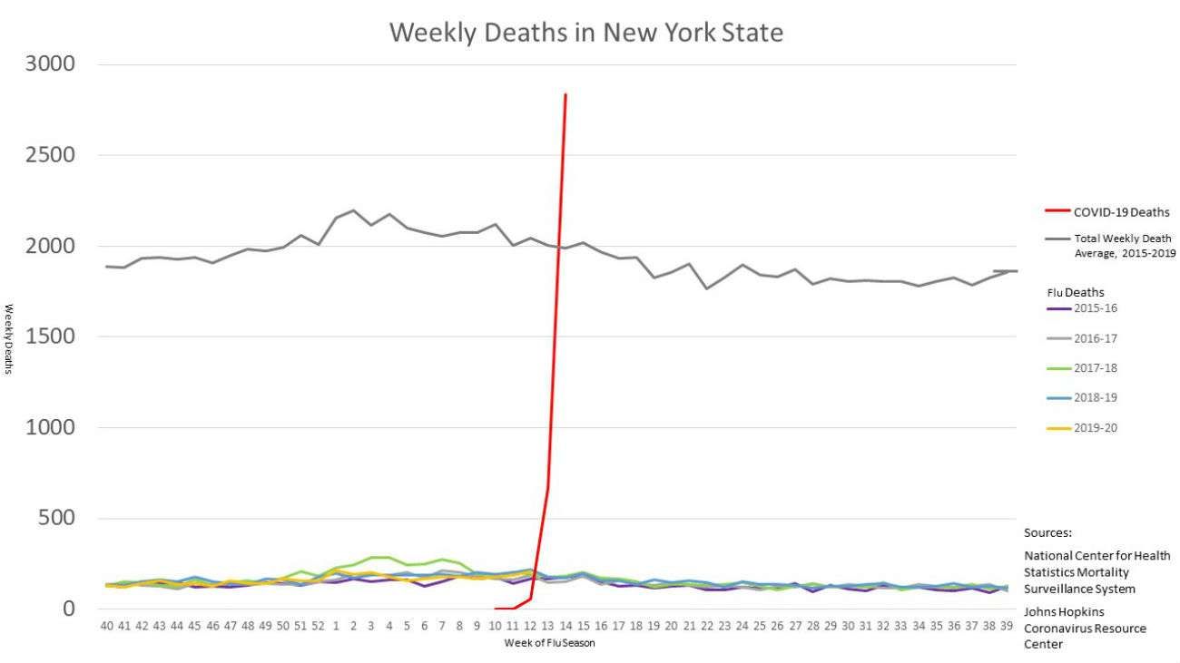 Da bi se bolje pozabavio razlikama između sezonske gripe i COVID-19, Max Roser i njegov tim usporedili su prosječan broj tjednih smrti u državi New York od gripe i svih ostalih uzroka u odnosu na tjedni broj smrtnih slučajeva od trenutne epidemija COVID-19. Imajte na umu da je prvi njujorški COVID-19 zabilježen prije samo četiri tjedna. Usporedba je zabrinjavajuća.
