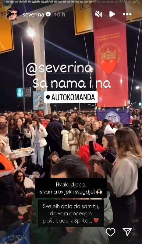 Jučer su studenti započeli 24-satnu blokadu Autokomande, jedne od najvažnijih prometnica u Beogradu. Na prosvjedima je odjeknula Severinina pjesma Italiana, uz poruku: “Severina s nama i na Autokomandi.” Pjevačica im je odgovorila emotivnom porukom: