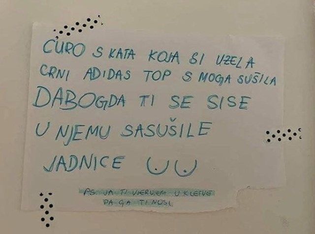Naime, jedna je žena posumnjala da joj je susjeda s kata ukrala sportski top, pa je odlučila poduzeti radikalne mjere kako bi joj se osvetila. 🤣