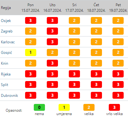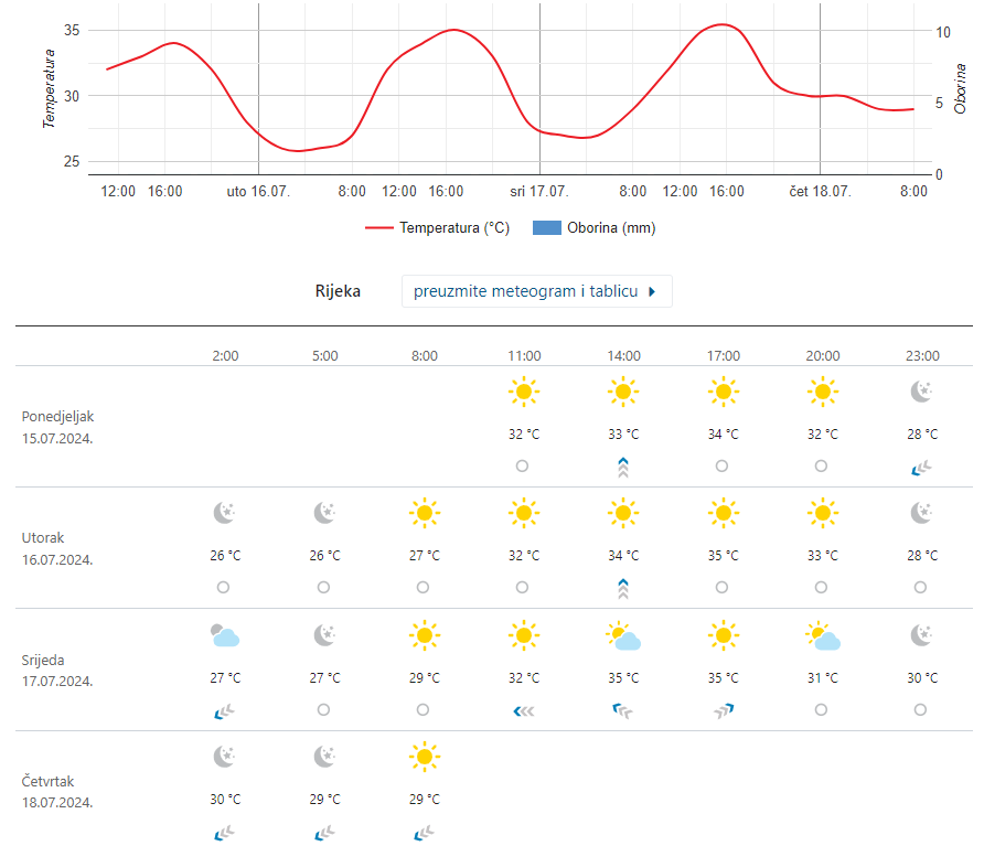 - Pretežno sunčano, vruće, ponegdje i vrlo vruće. Od sredine dana u unutrašnjosti lokalno pljuskovi s grmljavinom, ponajprije u istočnim krajevima mogu biti izraženiji. Vjetar većinom slab, na Jadranu do umjeren jugozapadni i sjeverozapadni. Najniža temperatura od 18 do 23°C, u Gorskoj Hrvatskoj niža, a na Jadranu između 23 i 28°C. Najviša dnevna uglavnom između 33 i 38°C.