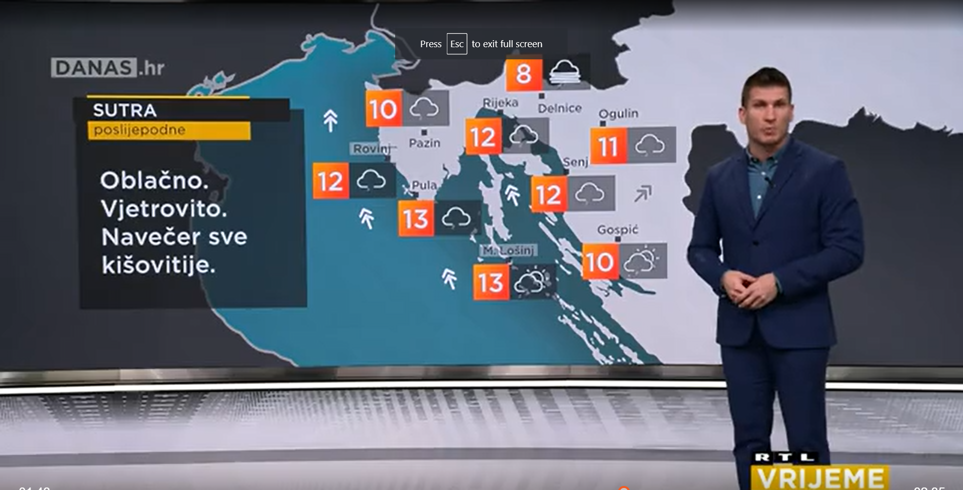 Poslijepodne u središnjoj i sjeverozapadnoj Hrvatskoj još uvijek barem djelomice sunčano, suho, ali i vjetrovito uz umjeren na udare jak jugozapadnjak, posebice u gorju. Temperatura će zato porasti, bit će ponegdje 15 °C, ali će se na vjetru činiti podjednako svježe kao i jučer. Na istoku izdizanje niskih oblaka te uglavnom pretežno sunčano, a zapuhati će umjeren južni i jugozapadni vjetar. Temperatura malo viša, oko 13-14 °C.