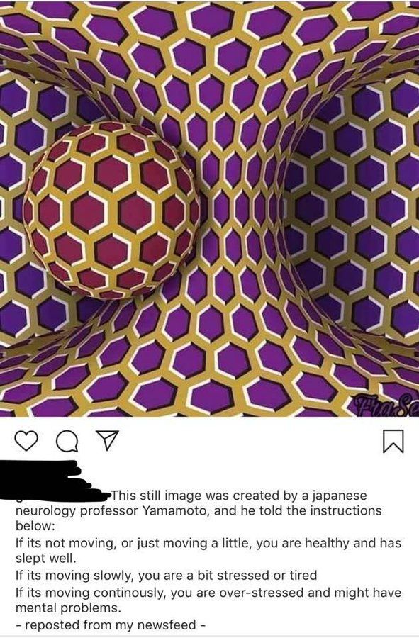 Djelo je japanskog profesora neurologije Yamamota Hashime, a sastoji se od mnoštva šesterokuta. Ljubičasta i žuta optička iluzija naizgled se pomiče, a ovisno o njenom kretanju saznat ćete jeste li pod stresom.